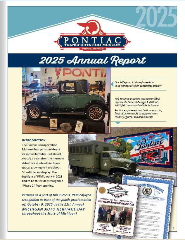 Thanks for looking! One more click below will launch our 501{c](3) organization’s Annual Report. We’d also encourage you to look at other pages in our website. The report chronicles a lot of important progress – and as we have launched – and extend our outreach to schools, and our contribution to Pontiac economic development. The report also provides significant insight as to how PTM has received and spent money. However, “official” finalized financial results will be available mid-year coincident with our third-party financial review and 990 filings.